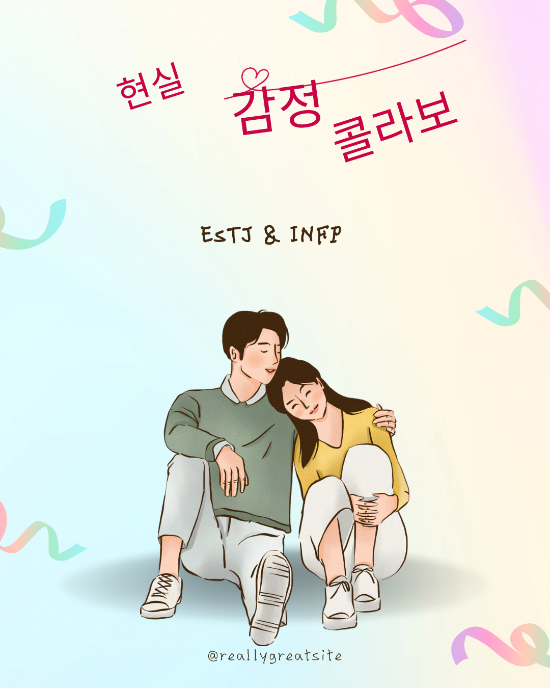 이과에서 많이 나오는 타입 흔히 '극이과'라고 부르는 타입 입니다. 현실을 보고 논리적으로 생각하는 리더 ESTJ(논리적이고 현실적인 리더)와 현실보단 당찬미래를 생각하는 INFP(이상적인 감성가) 는 정반대의 성격을 가지고 있지만, 그 차이를 서로서로 매워조는 특별한 균형을 만들어낼 수 있는 조합입니다. 그렇다면, ESTJ와 INFP의 연애는 어떤 모습일까요?
